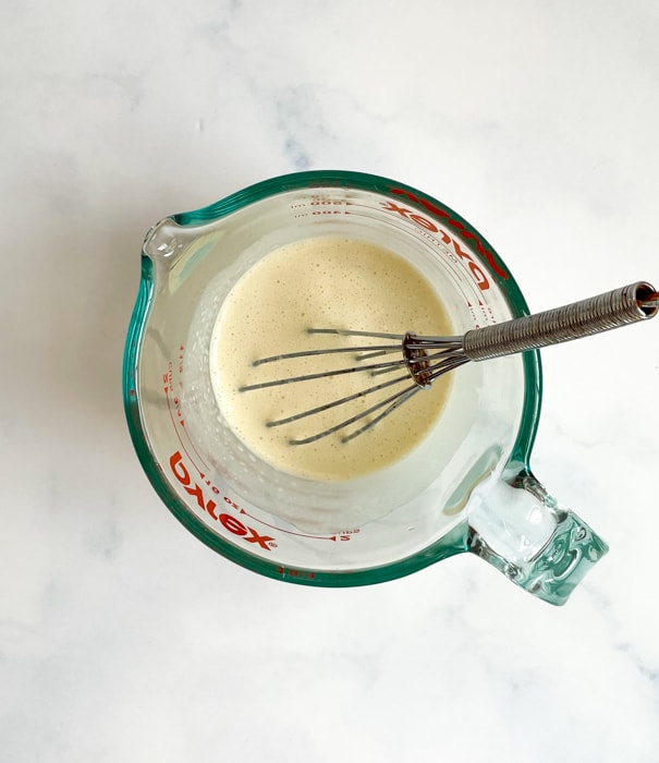 - Lightly whisk together the vanilla extract (1 teaspoon), heavy cream (117 grams, ½ cup), and the egg (1 large).