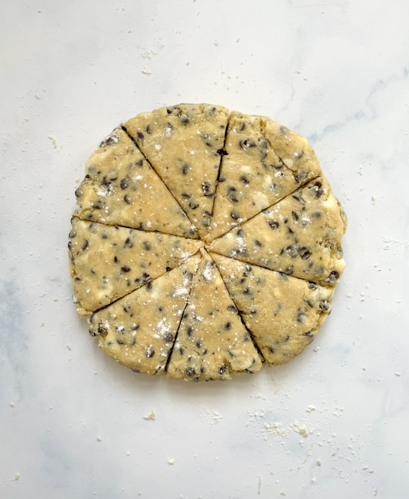 Pat the dough out to about a 7-inch (18 cm) circle (about 1.5-inch, 4 cm thick). Cut into 8 triangle-shaped pieces. I like to use a bench knife for this, but a sharp knife also works.