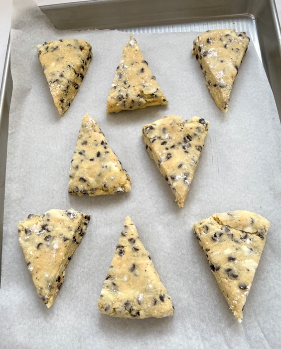For rectangle shaped scones: after you have folded the dough 6 times, shape it into a square instead of a circle. Cut down the middle using your bench knife vertically and then horizontally. You should know have 4 squares. Cut the 4 squares in half to create 8 total rectangles.