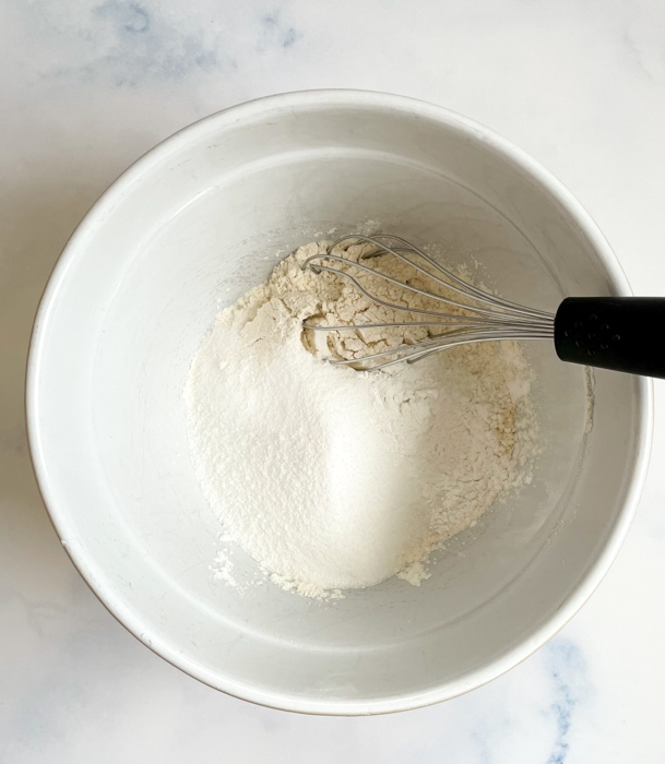 - In a large bowl whisk together the flour (240 grams, 2 cups), sugar (100 grams, ½ cup), baking powder (10 grams, 1 tablespoon), and salt (½ teaspoon).