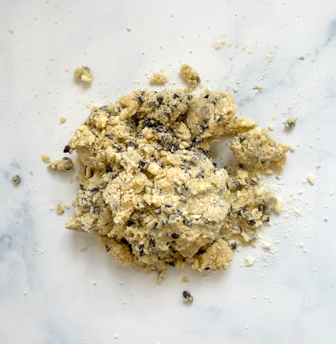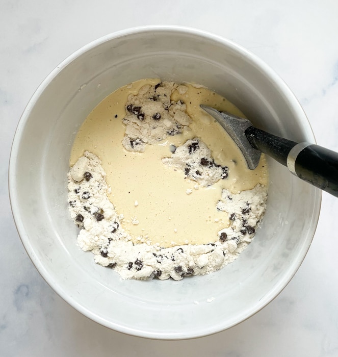 Add the wet ingredients to the bowl with the flour/butter mixture and stir together using a rubber spatula. The dough will look very incohesive and shaggy.