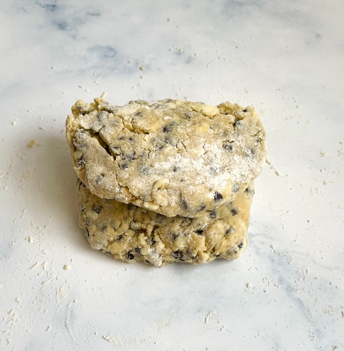 Gently fold the dough in half using a bench knife or metal spatula. Turn it 90 degrees. Pat out and fold again for a total of 6 times. The dough will likely crumble during the first few turns. Be very gentle and keep patting it back together. This process is creating layers which will create flaky scones.