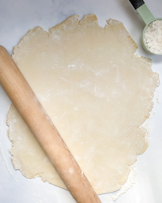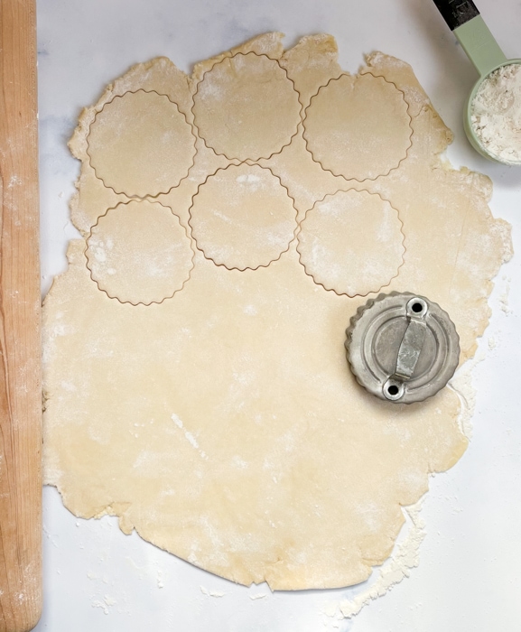 - After fermenting, sprinkle flour over the top of the dough. Remove from the bowl and divide dough in half. Roll out the dough using a rolling pin on a lightly floured surface. Roll to about ⅛- inch (0.3 cm) thick. If your dough is shrinking back on your as you roll it, let it sit out for 5-10 minutes to relax before rolling. Cut out 2 ½ inch (6.35 cm) circles from the rolled out dough (I use a cookie cutter but you can also use an overturned cup).