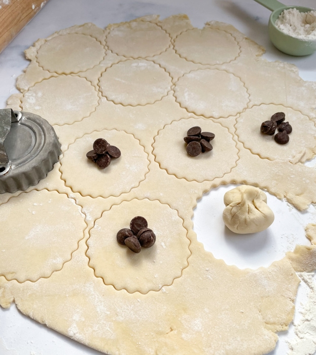 - Dip a finger in water and wet the rim of each circle. Put 4-5 chocolate chips in the center of each circle and bring the sides to the middle, pinching to seal.