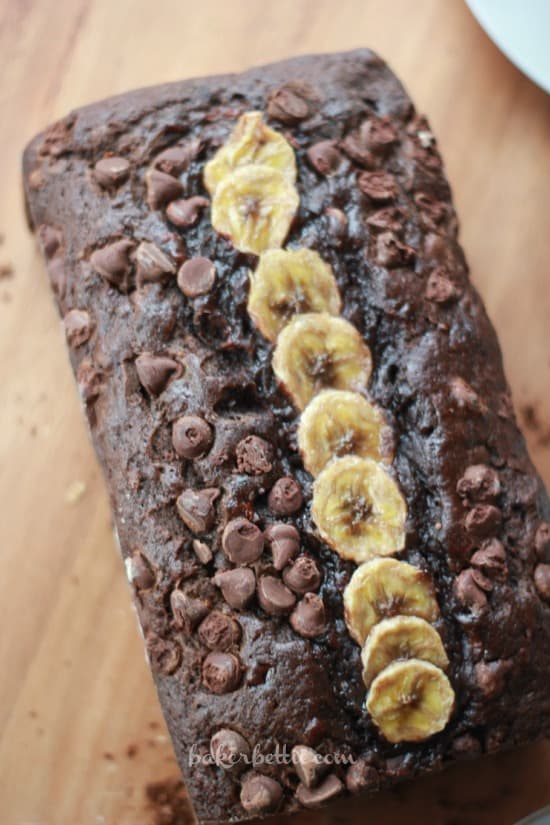 I’ve been putting chocolate chips in banana bread for years, but this definitely takes it to a whole new level! Fabulous recipe. Love the sliced bananas on top! Another winner.