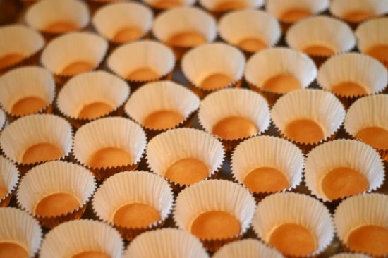 - Line up the baking cups (40 mini) on a sheet pan. Put a vanilla wafer (40 mini) into each cup, flat side down. Set aside.