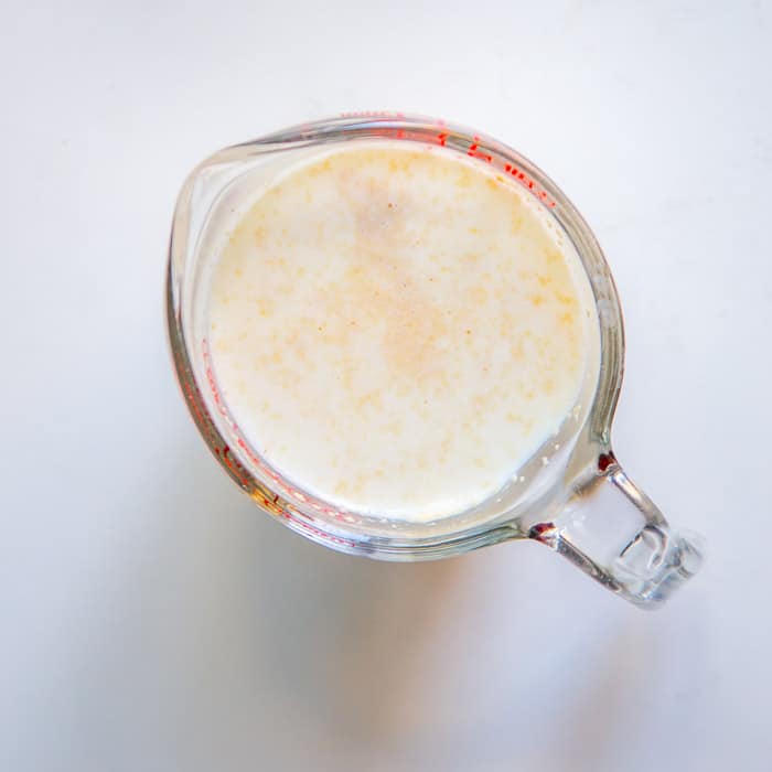 Warm the milk to about 110 F (43 F) and mix the yeast into the milk. I like to use quick-rise yeast because it works so quickly, but active dry yeast can also be used.