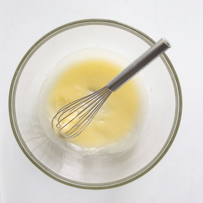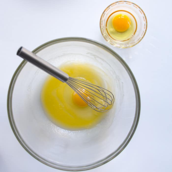 In a large mixing bowl, mix together the melted butter, sugar, and salt. Add one egg at a time and mix to combine.