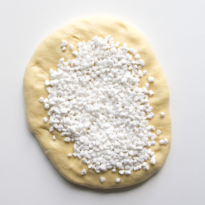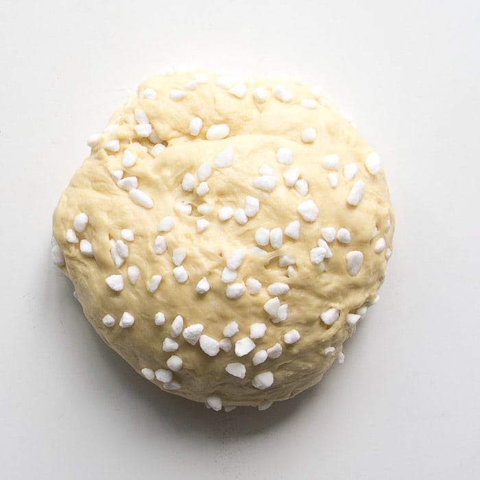 - ADD THE PEARL SUGAR: Flatten the dough out on a lightly floured work surface and add the pearl sugar. Knead the pearl sugar into the dough until evenly distrubted. Alternatively, you can knead the sugar into the dough in a stand mixer with a dough hook.