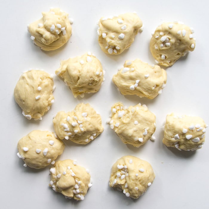 Pearl sugar will also be added to this basic dough. Pearl sugar can be purchased online or you can make your own pearl sugar substitute by breaking up sugar cubes into smaller pieces.