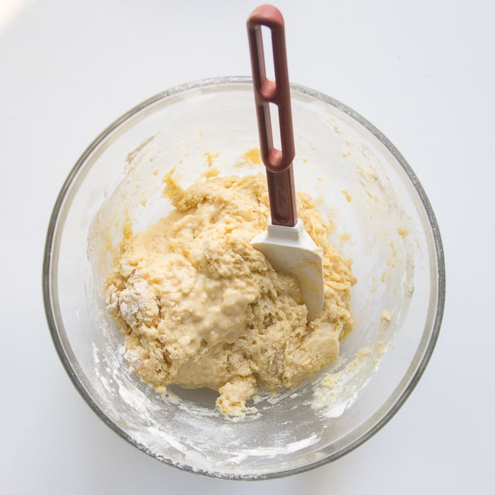- ADD THE FLOUR: Stir in the flour until it is hydrated. The dough will be shaggy at this point.